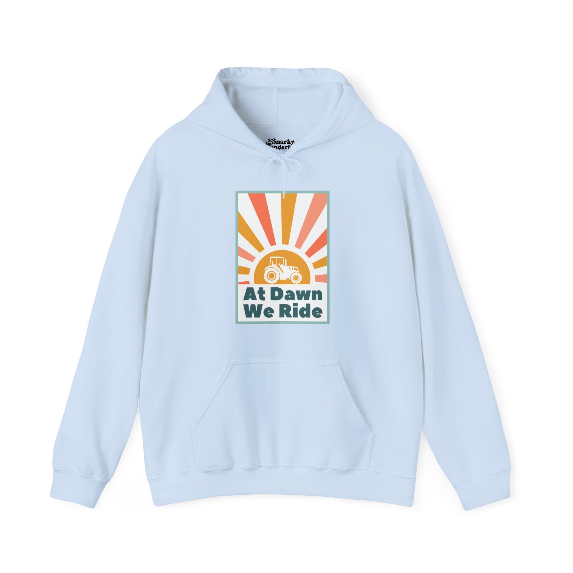 Get ready to greet the sunrise with our "At Dawn We Ride" hoodie, a must-have for all the dedicated gardeners and early risers out there! This playful hooded sweatshirt features a charming tractor design, perfect for those who love starting their day with the hum of garden tools and the smell of fresh soil.