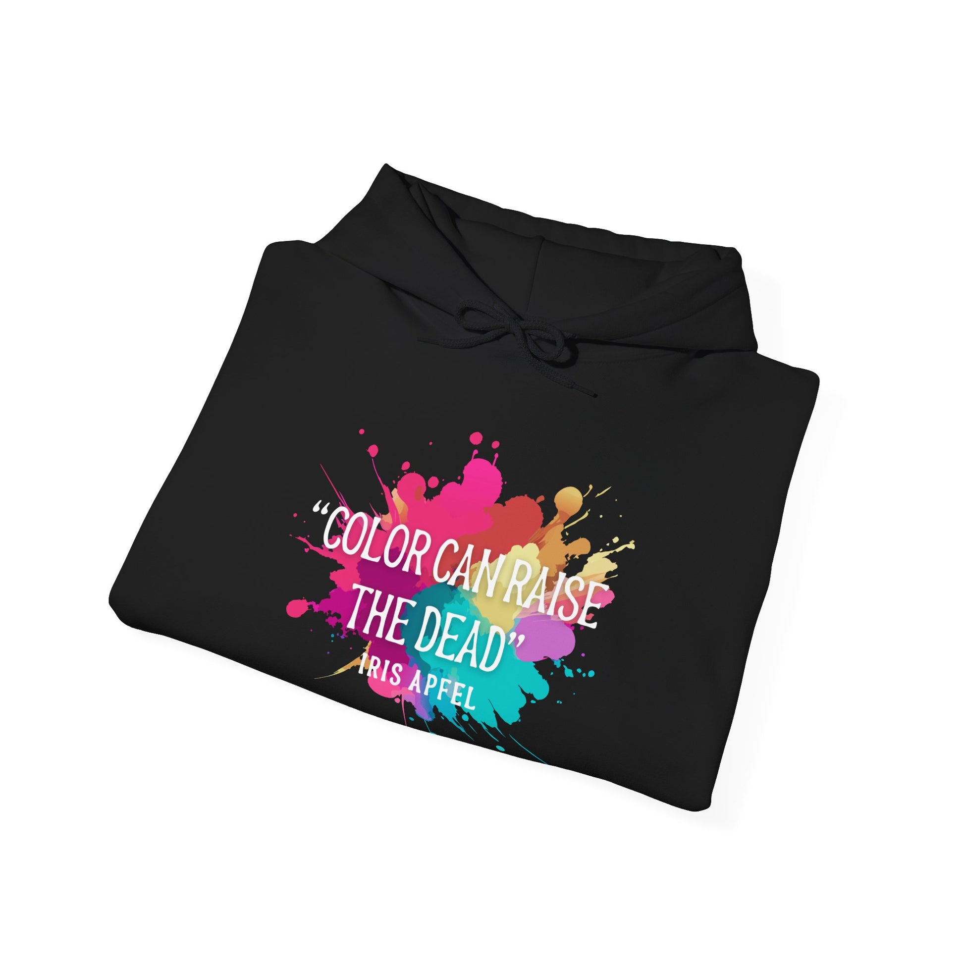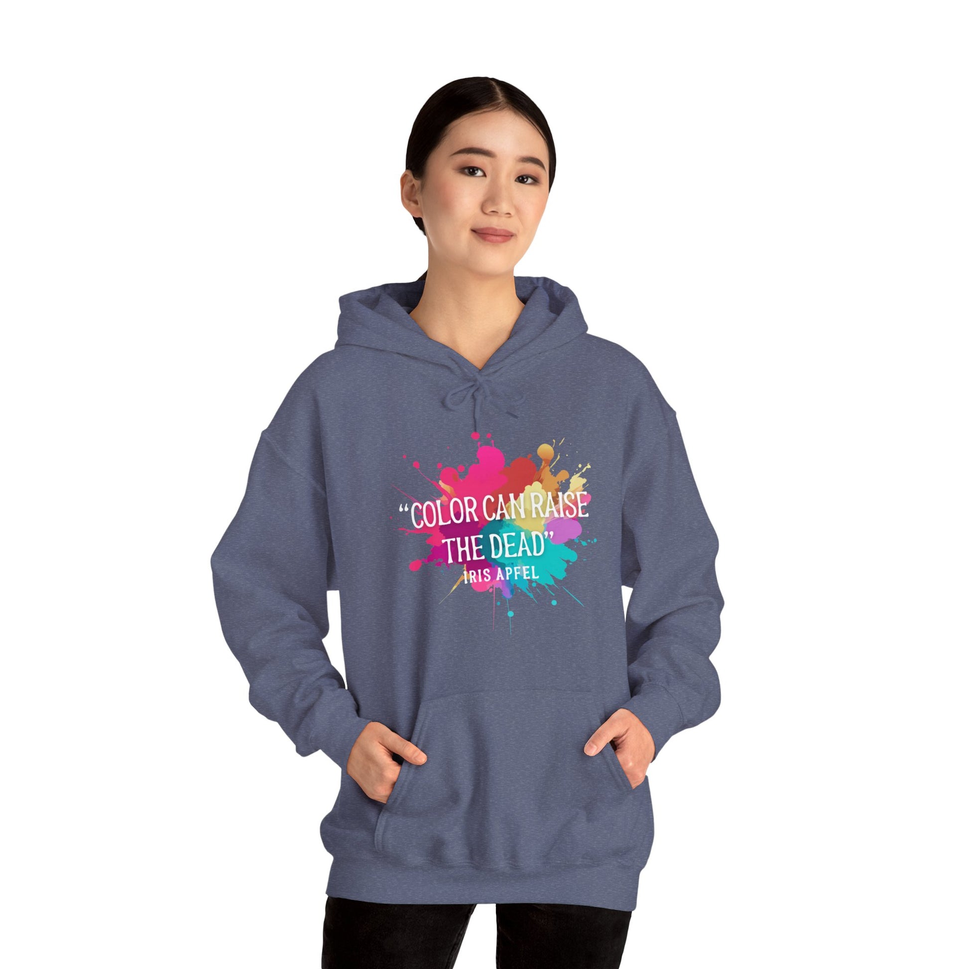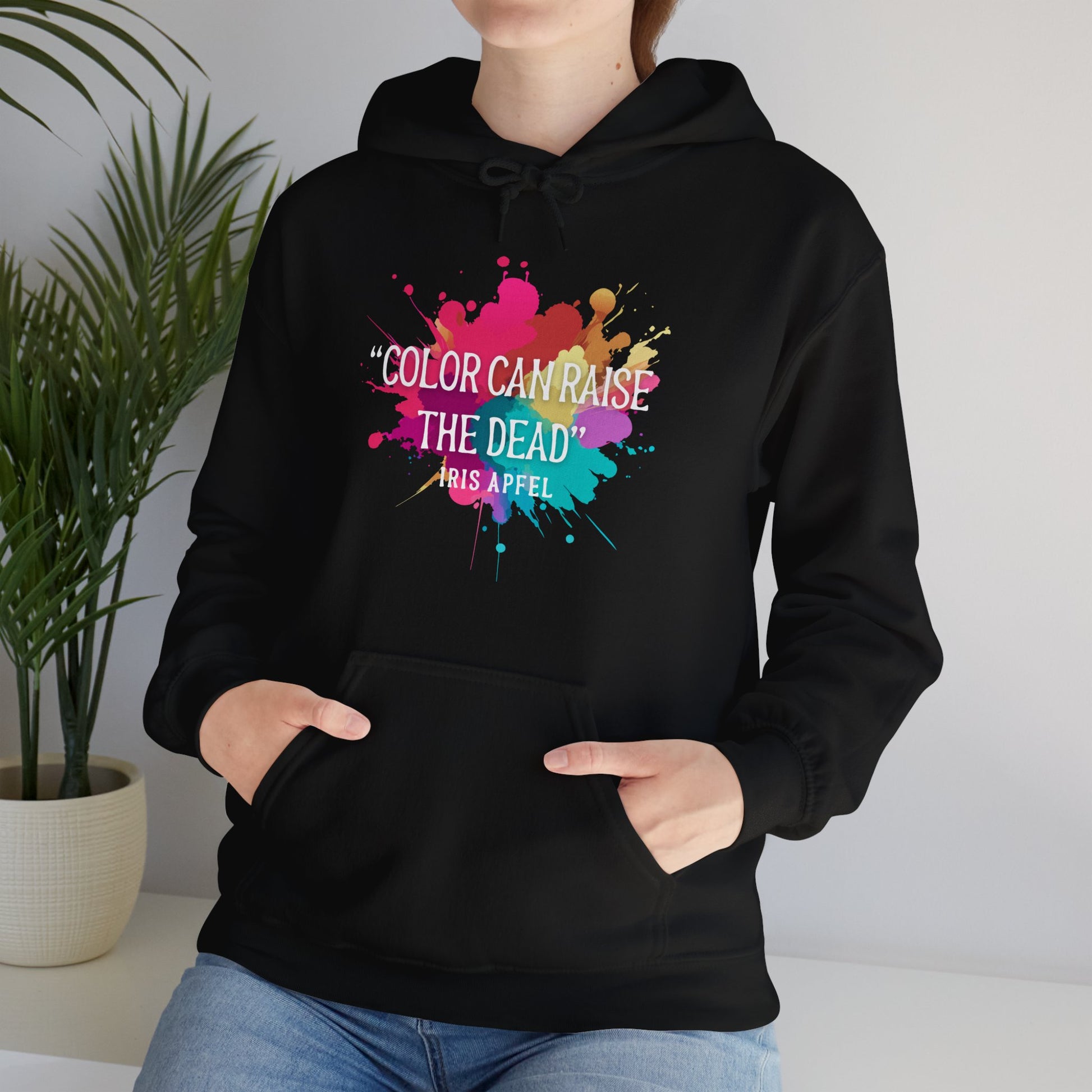 Embrace the vibrant wisdom of fashion icon Iris Apfel with our "Color Can Raise the Dead" hoodie! This bold and stylish sweatshirt is a tribute to the power of color and its ability to transform, uplift, and invigorate. Perfect for those who love to make a statement with their wardrobe, this shirt celebrates the fearless use of color in our creative projects.
