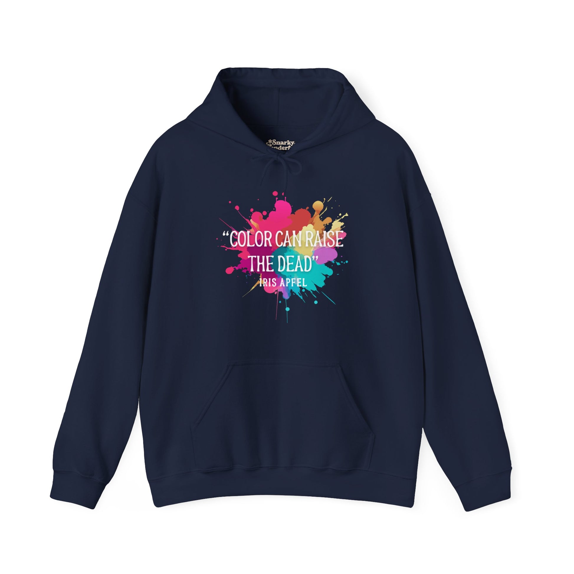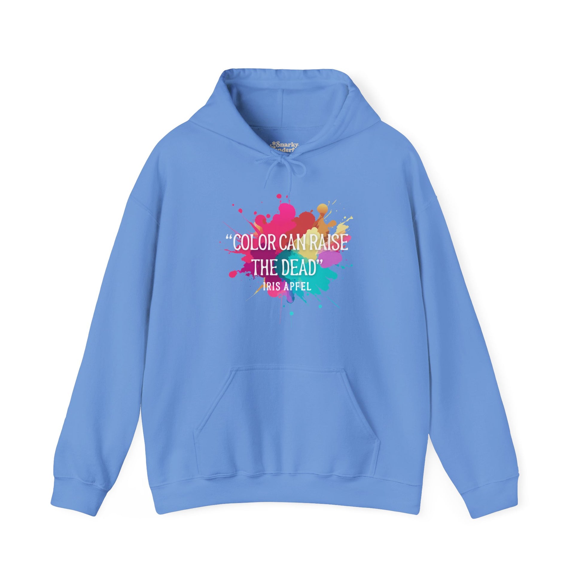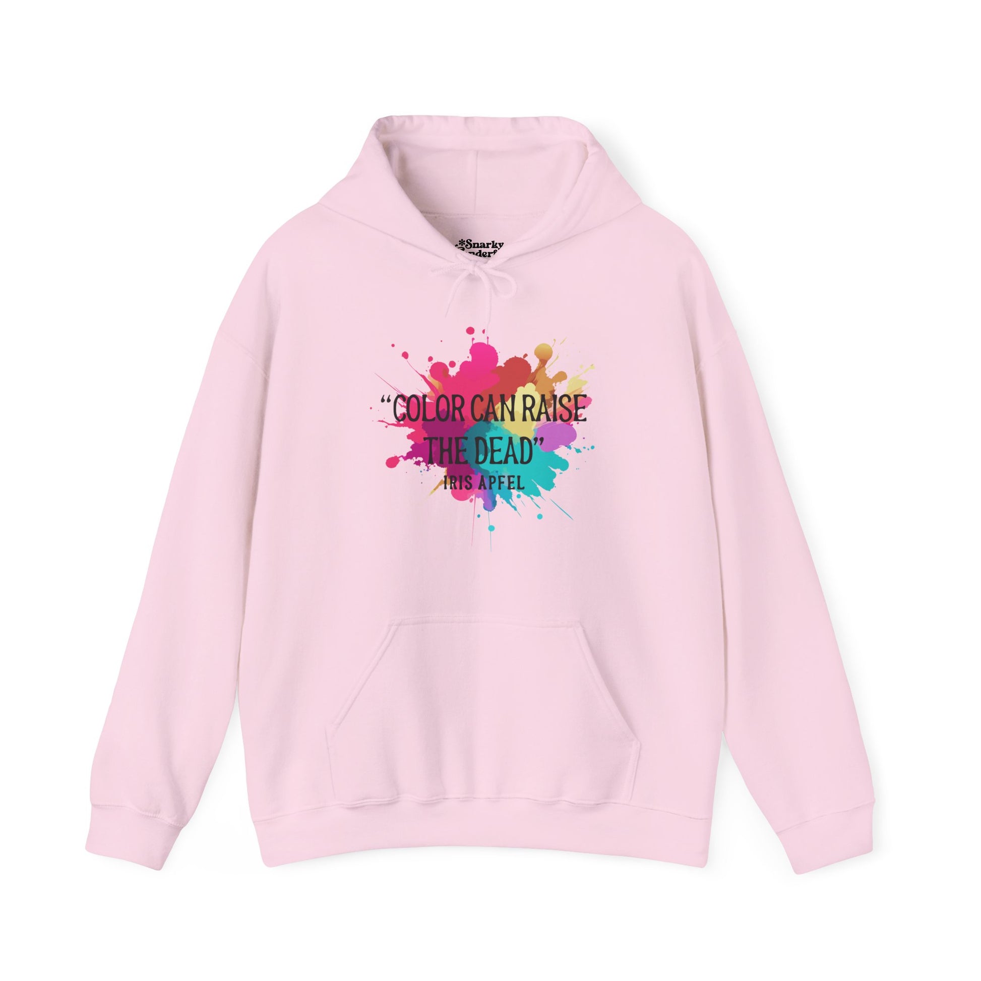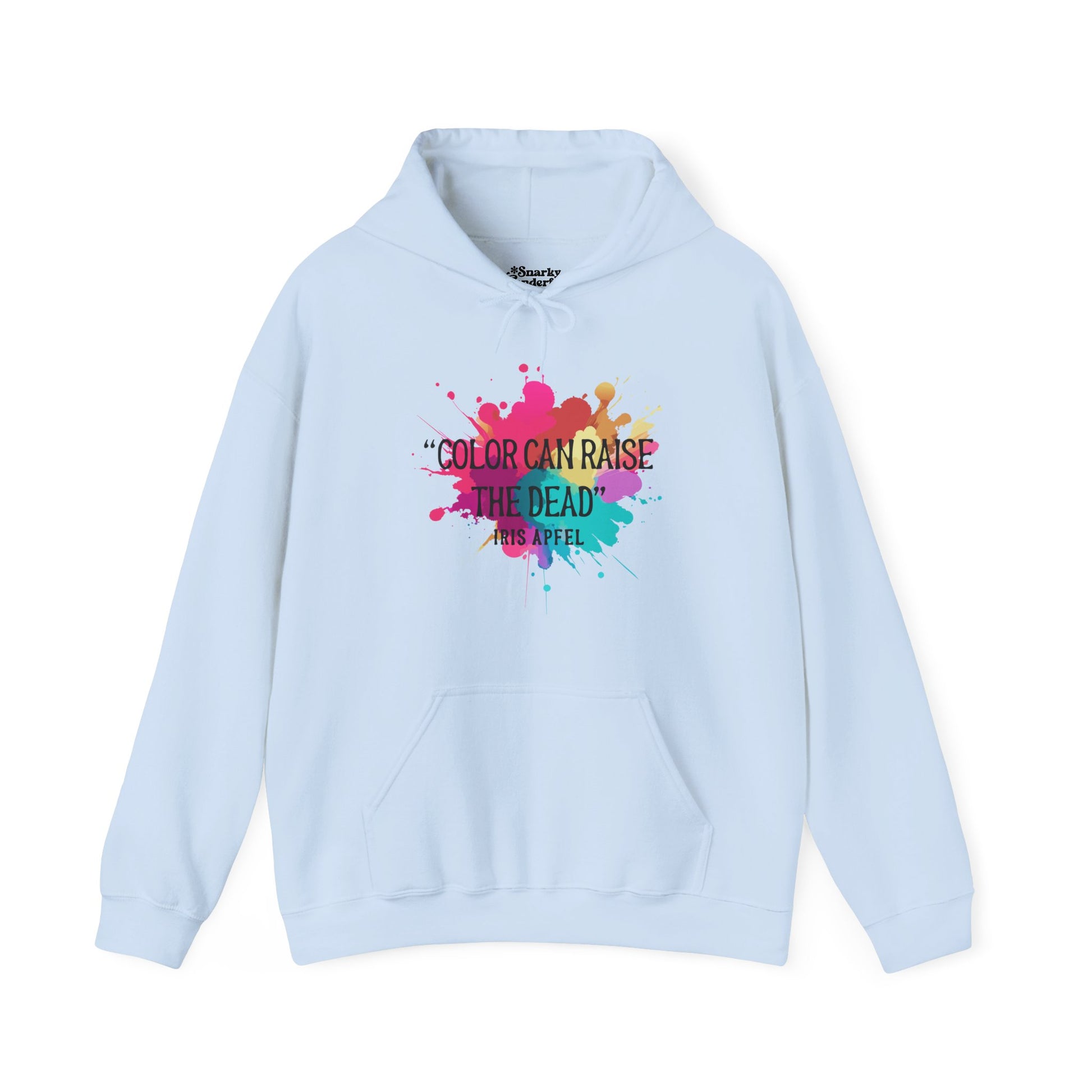 Embrace the vibrant wisdom of fashion icon Iris Apfel with our "Color Can Raise the Dead" hoodie! This bold and stylish sweatshirt is a tribute to the power of color and its ability to transform, uplift, and invigorate. Perfect for those who love to make a statement with their wardrobe, this shirt celebrates the fearless use of color in our creative projects.