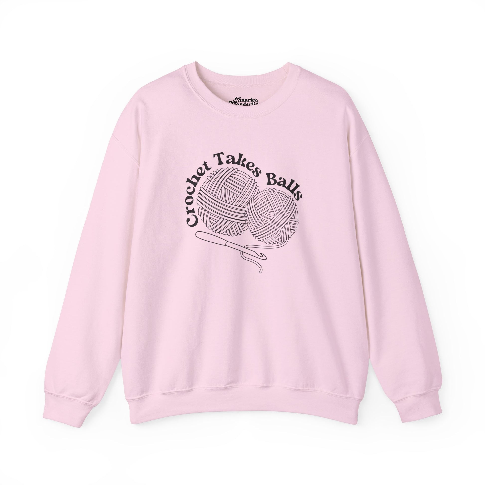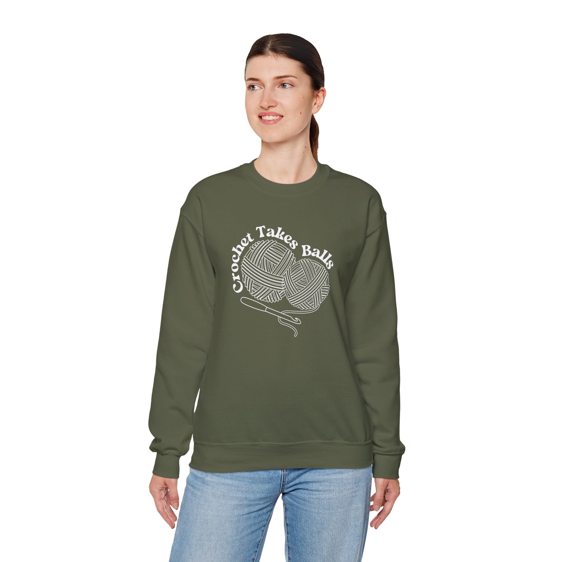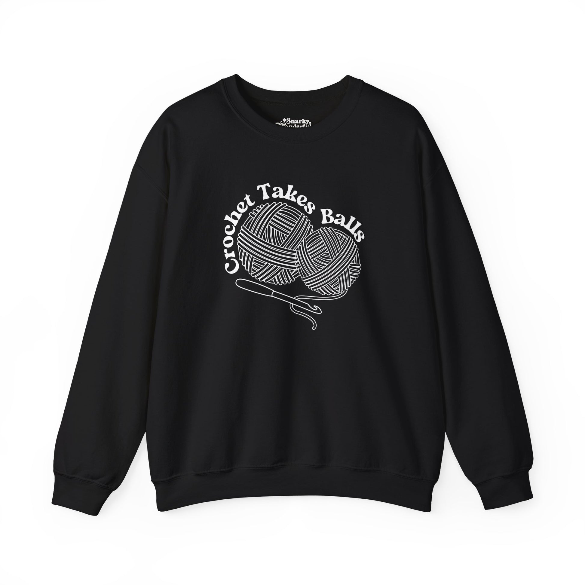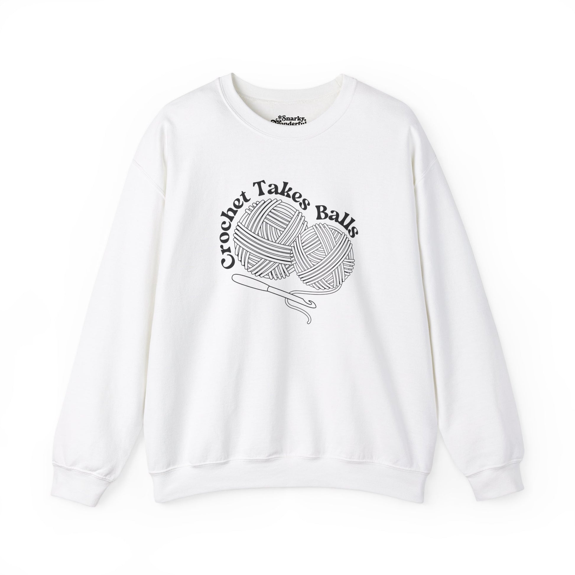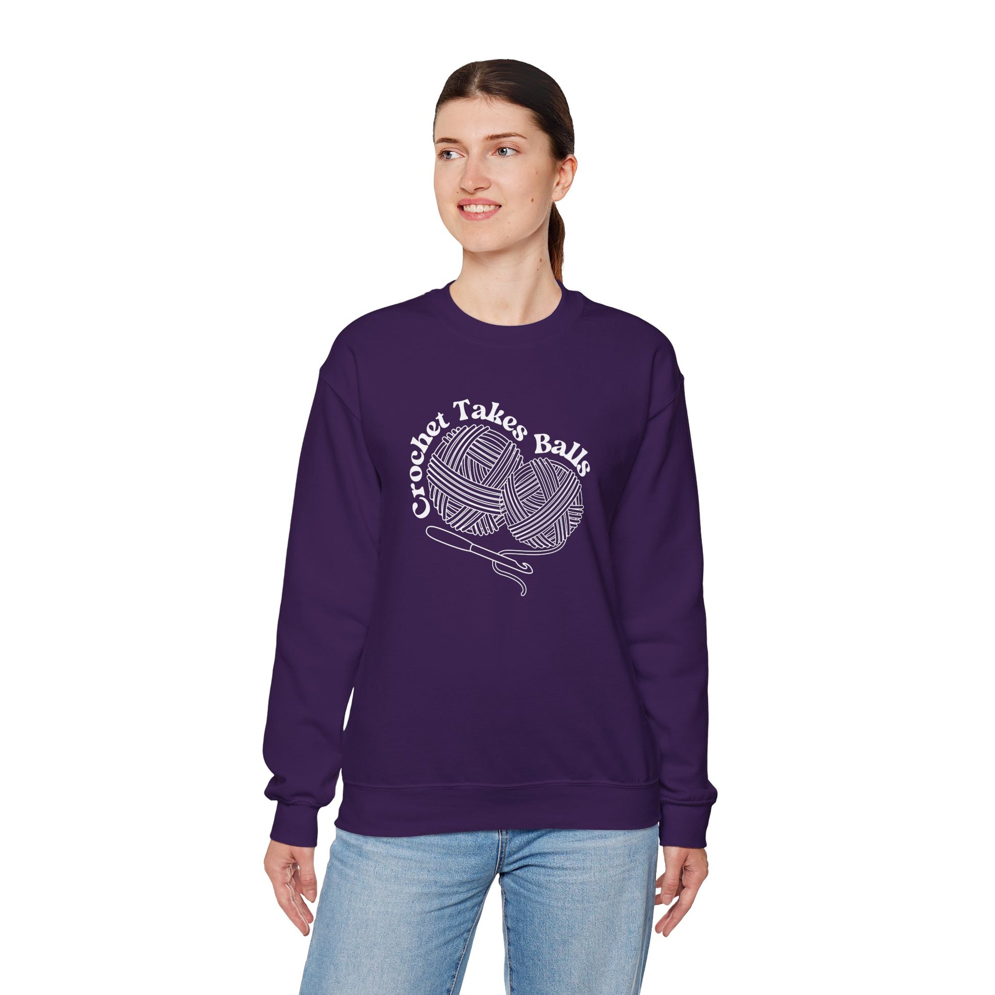 Get ready to make a bold statement with this cheeky 'Crochet Takes Balls' sweatshirt! Featuring two playful balls of yarn and a crochet hook front and center, this design is perfect for anyone who knows that crochet isn't for the faint of heart.