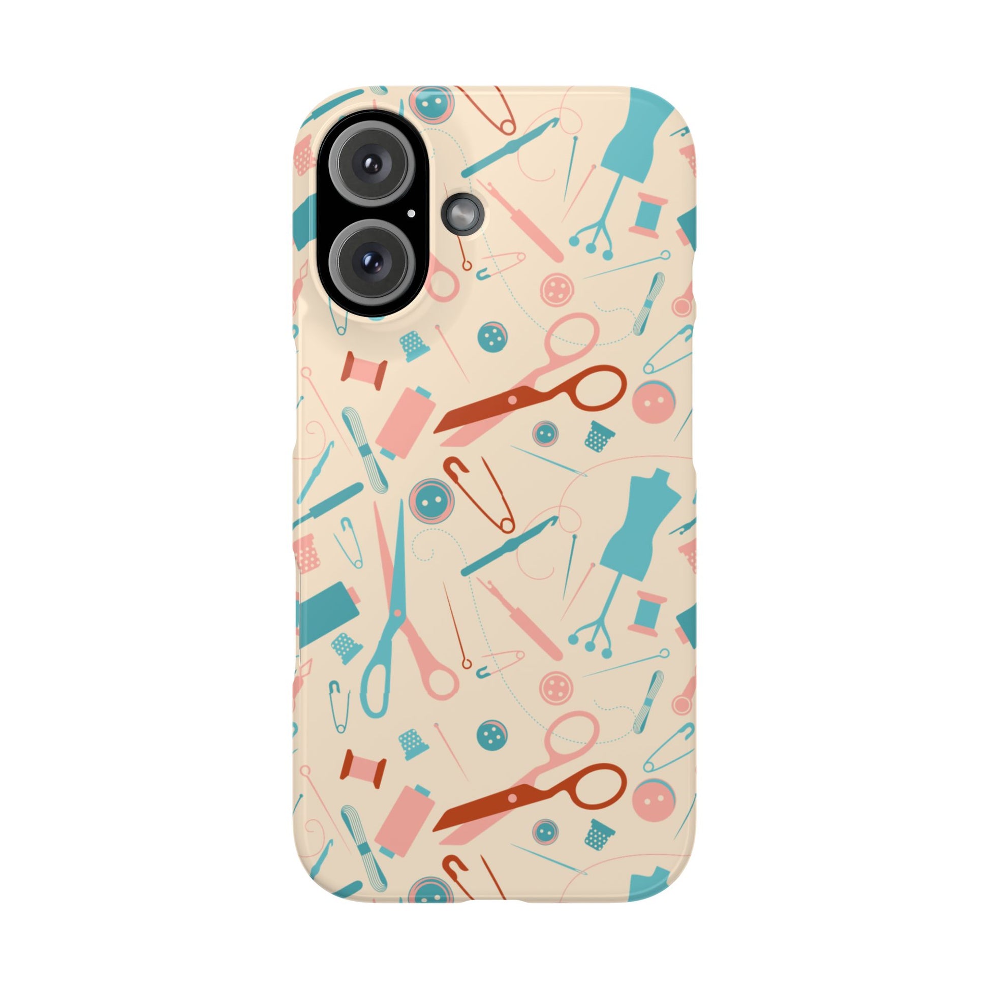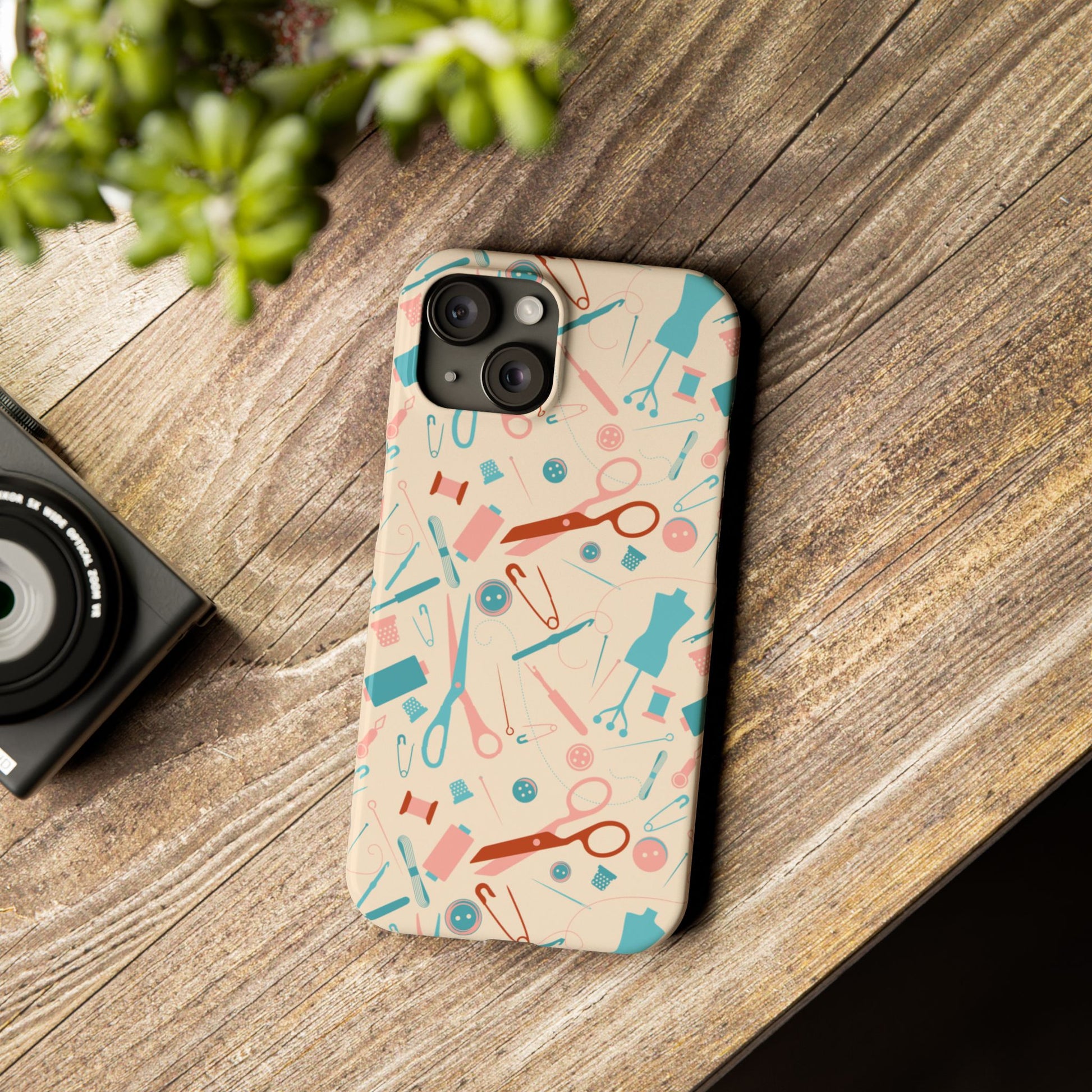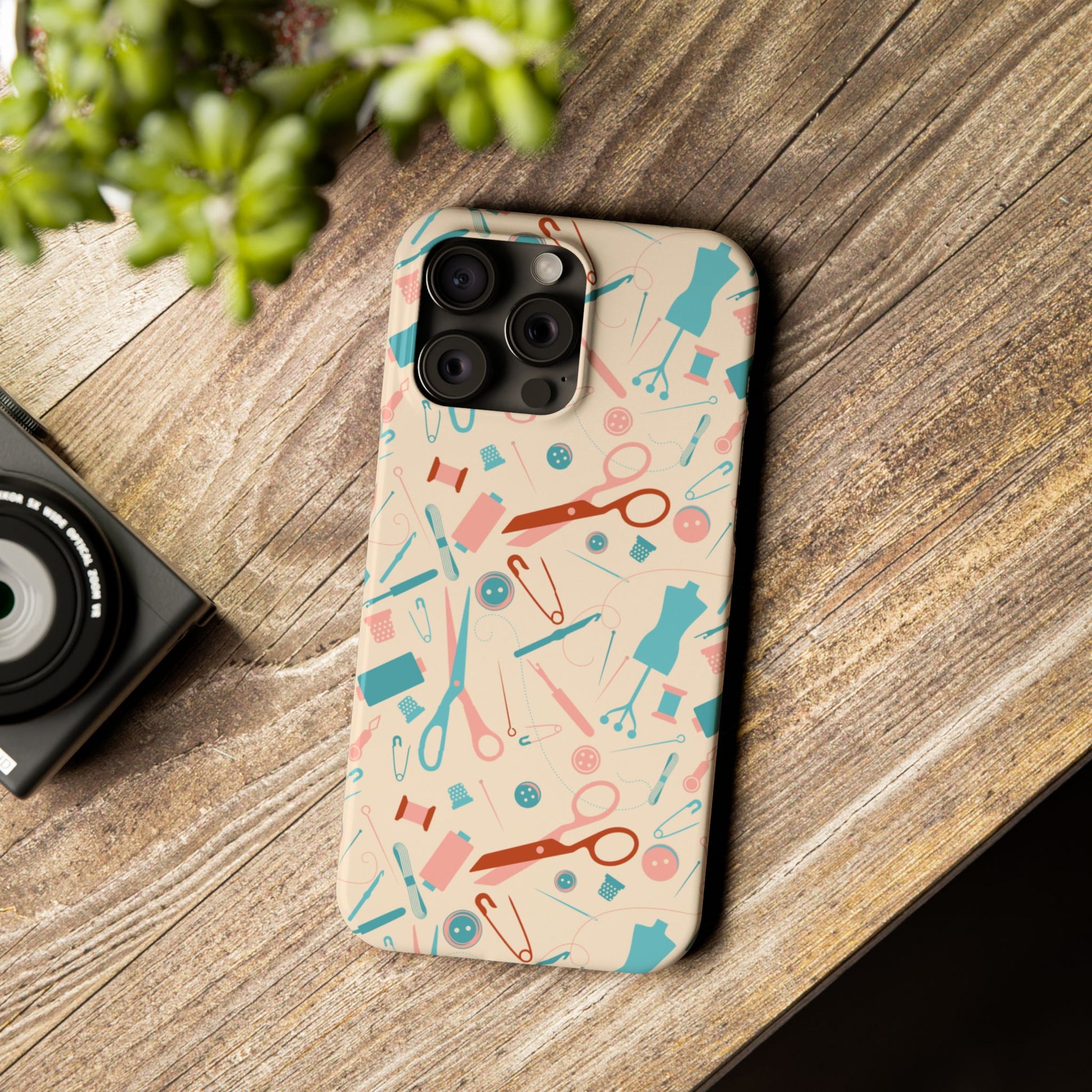 Celebrate your passion for sewing! Oh - and wear it on your phone, too. This design features a colorful array of essentials displayed against a light background. Combining functionality with charm, this case offers reliable protection while reflecting your love for the "sewing arts." It's an ideal accessory for sewists who appreciate both style and practicality.