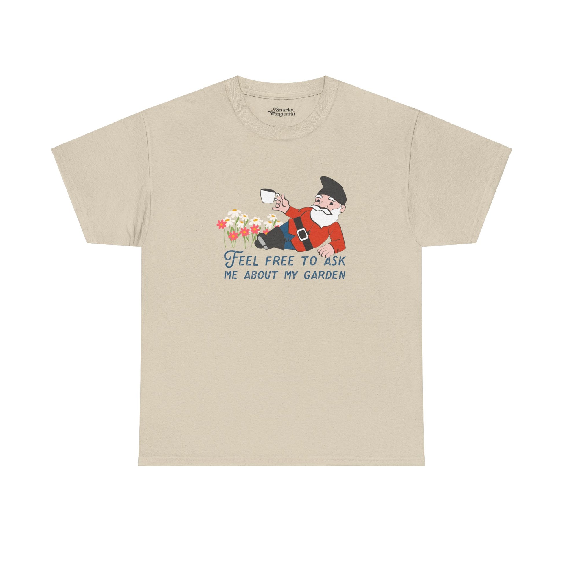 Show off your gardening pride with a playful twist in our 'Feel Free to Ask Me About My Garden' t-shirt! Featuring a cheeky gnome sipping coffee next to his flowers, this design is perfect for plant lovers who enjoy sharing their green thumb stories.