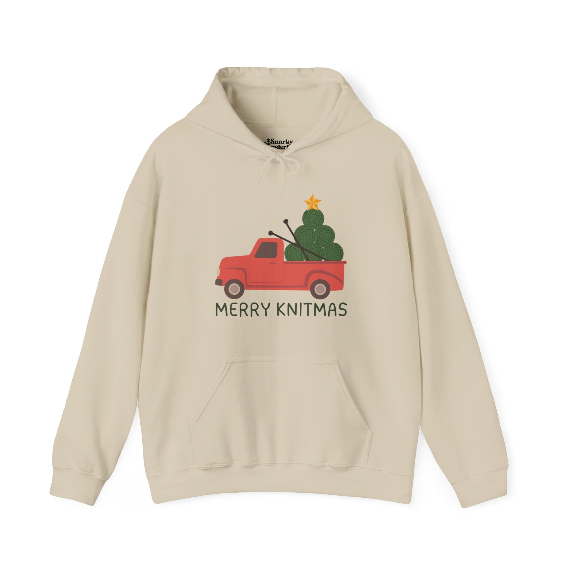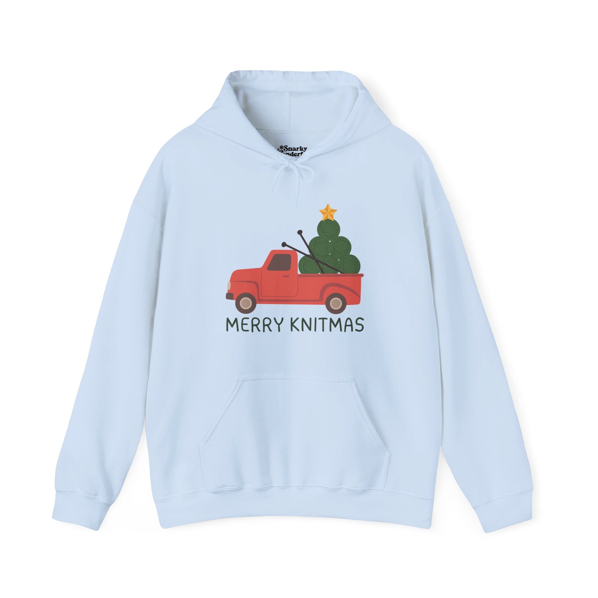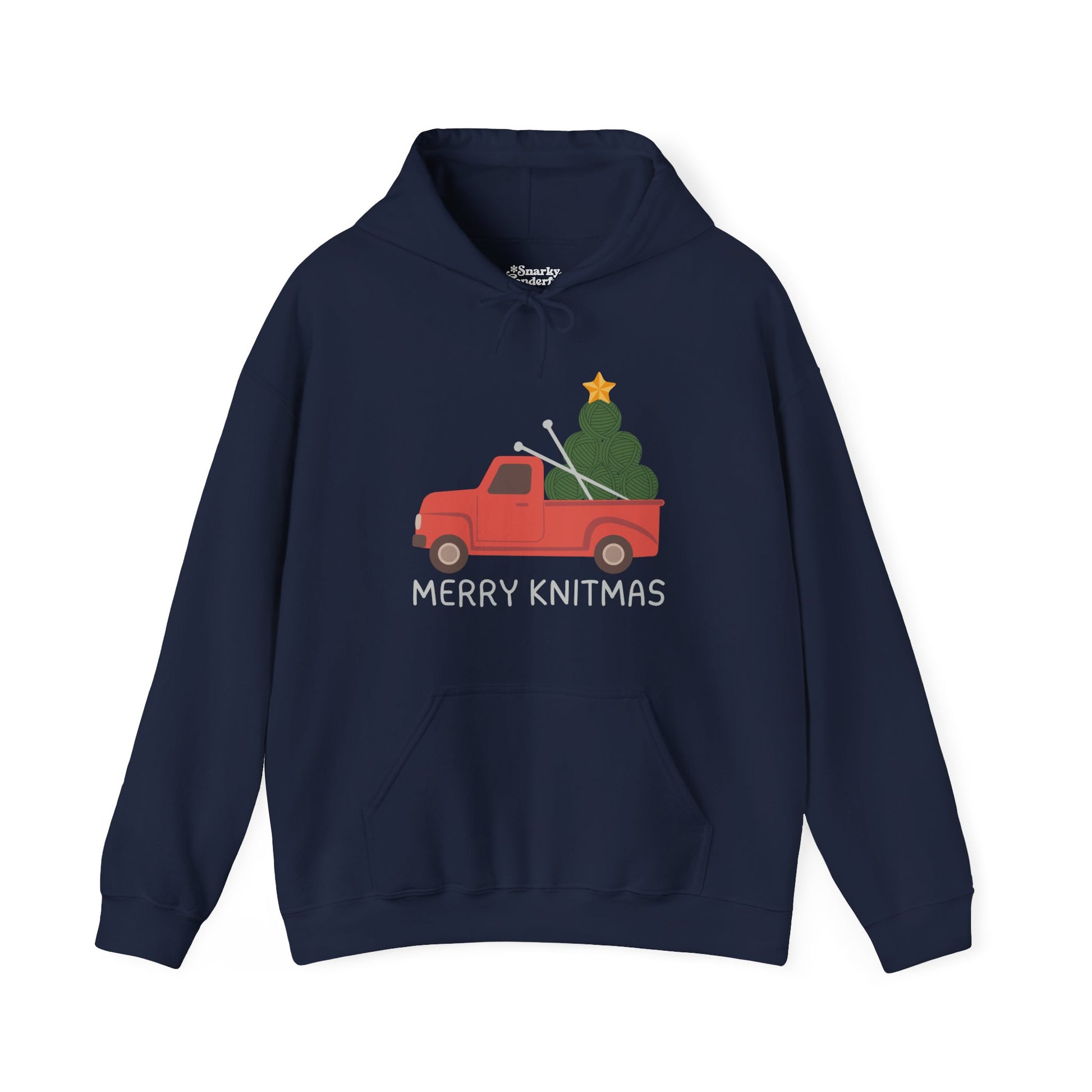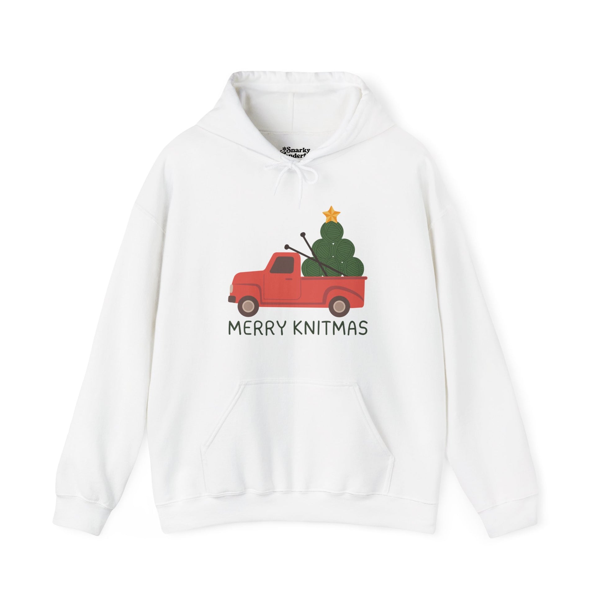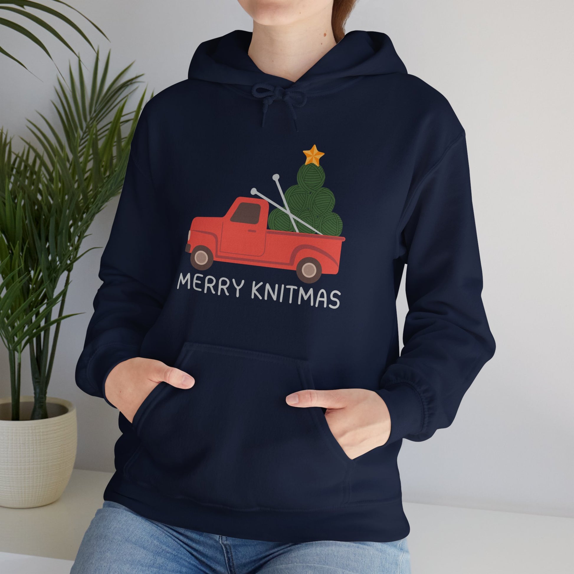 Celebrate the season with a warm 'Merry Knitmas'! This hooded sweatshirt brings together the charm of a classic Christmas truck with a twist that knitters will love.