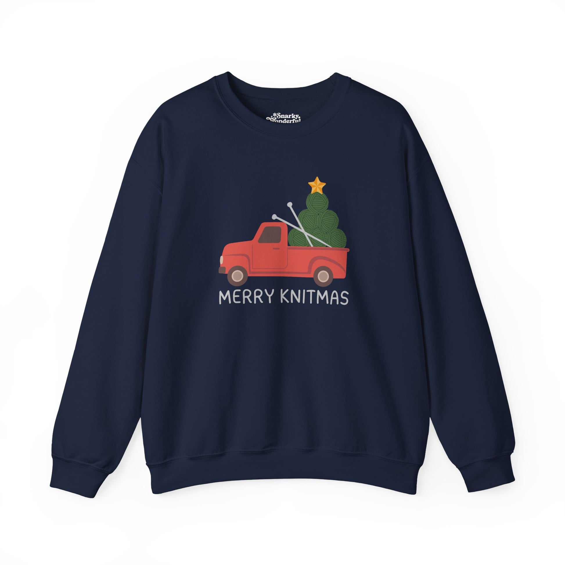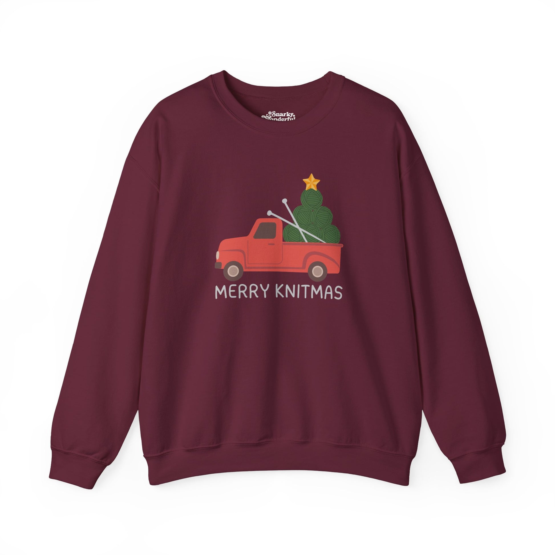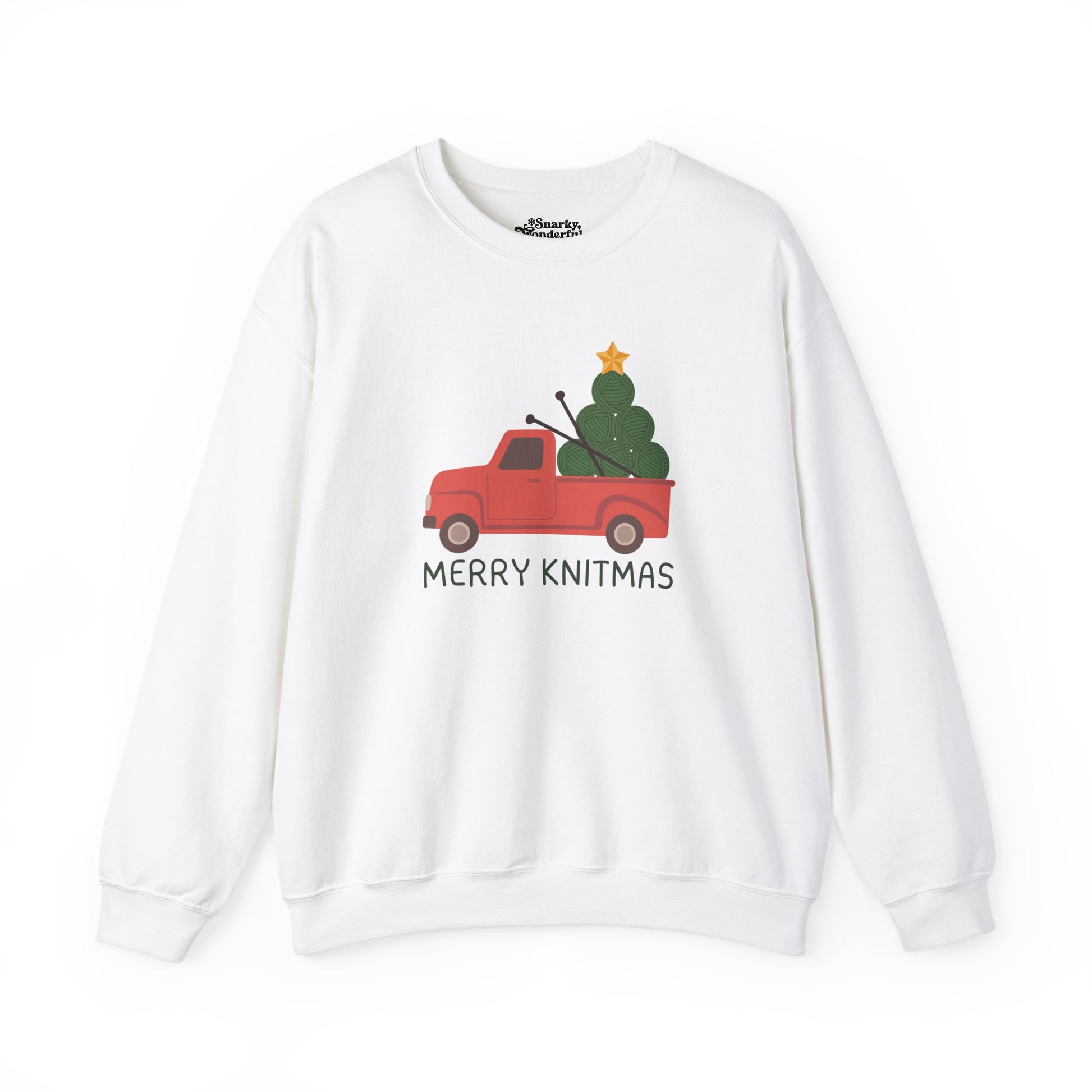 Celebrate the season with a warm 'Merry Knitmas'! This sweatshirt brings together the charm of a classic Christmas truck with a twist that knitters will love.