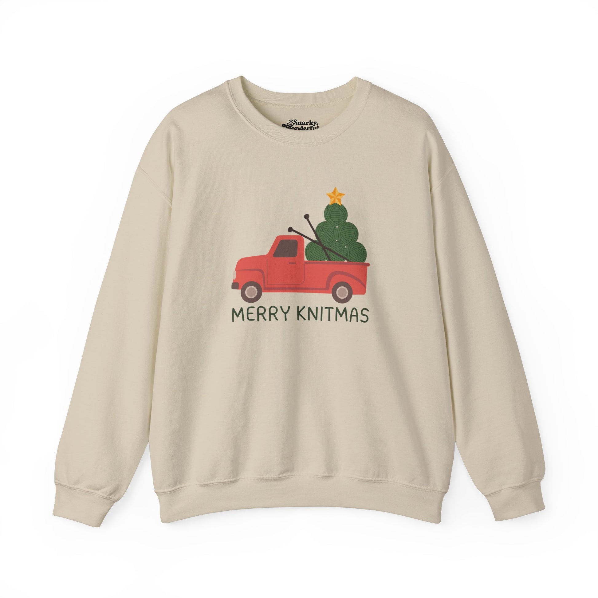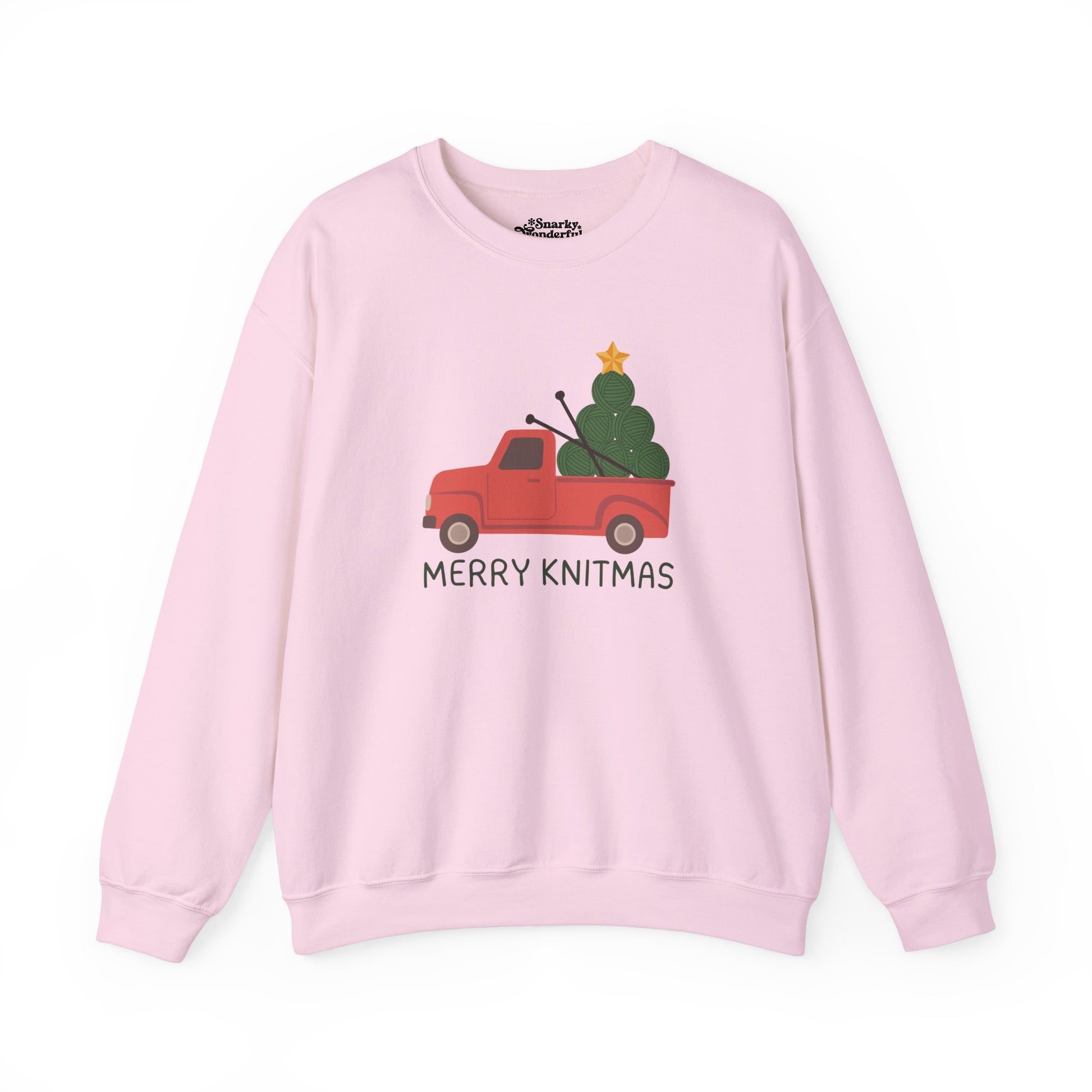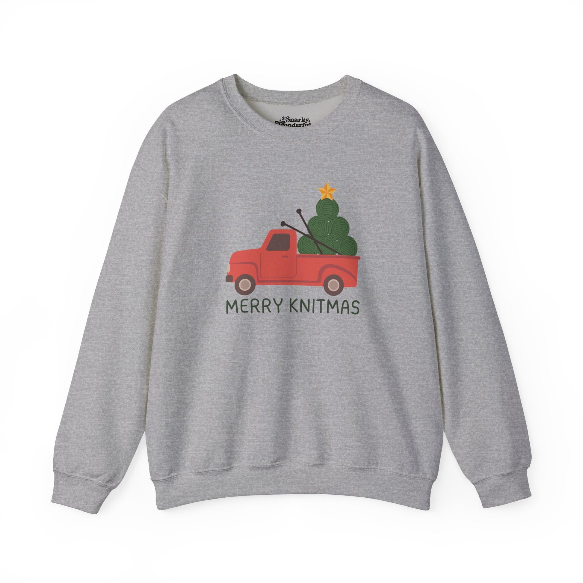 Celebrate the season with a warm 'Merry Knitmas'! This sweatshirt brings together the charm of a classic Christmas truck with a twist that knitters will love.
