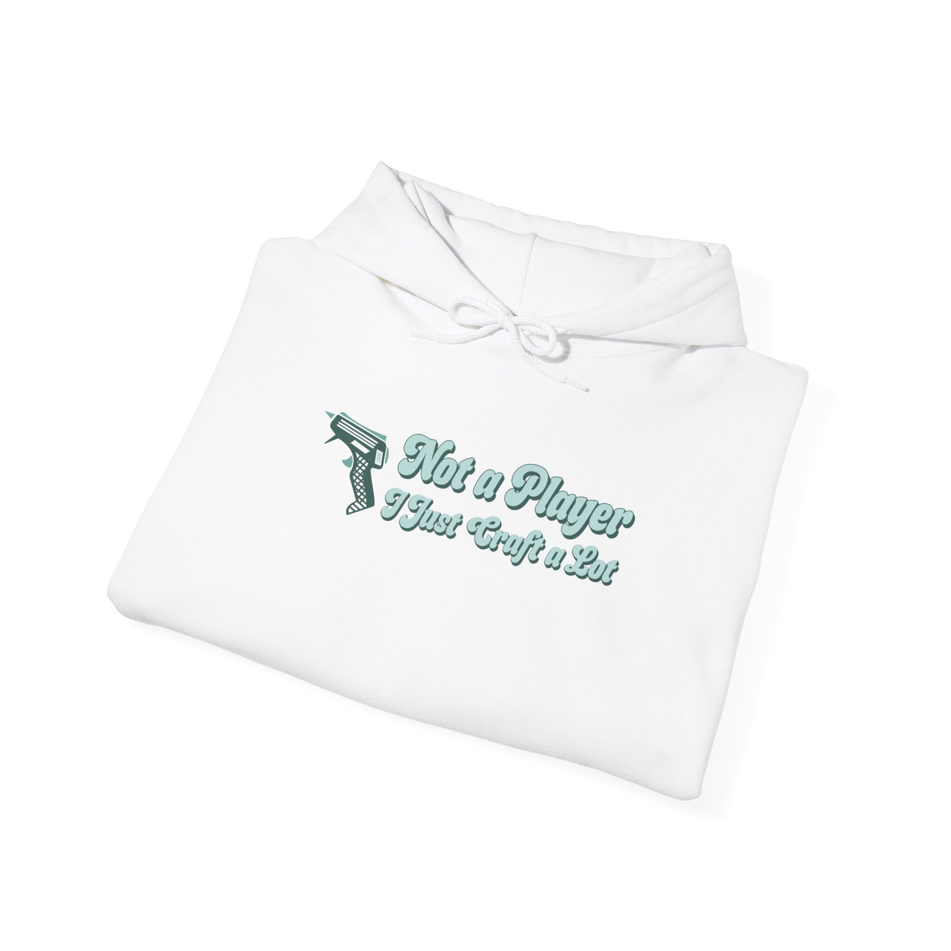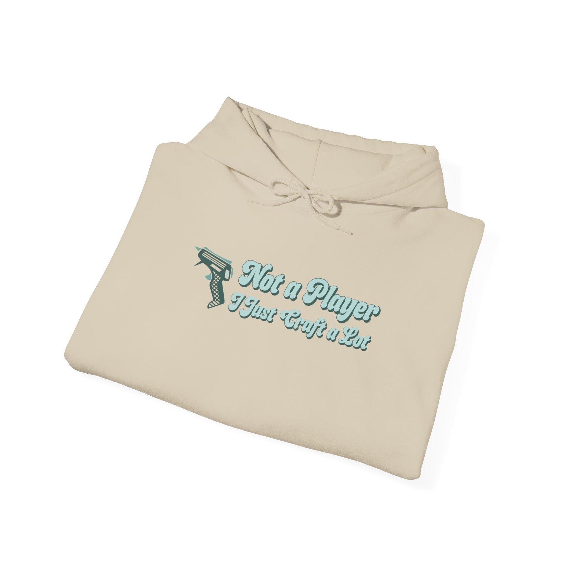 Channel your inner crafting legend with this playful 'Not a Player, I Just Craft a Lot' hooded sweatshirt! Featuring a graphic of a glue gun, this design is a fun nod to the classic Big Pun song, reimagined for creators.