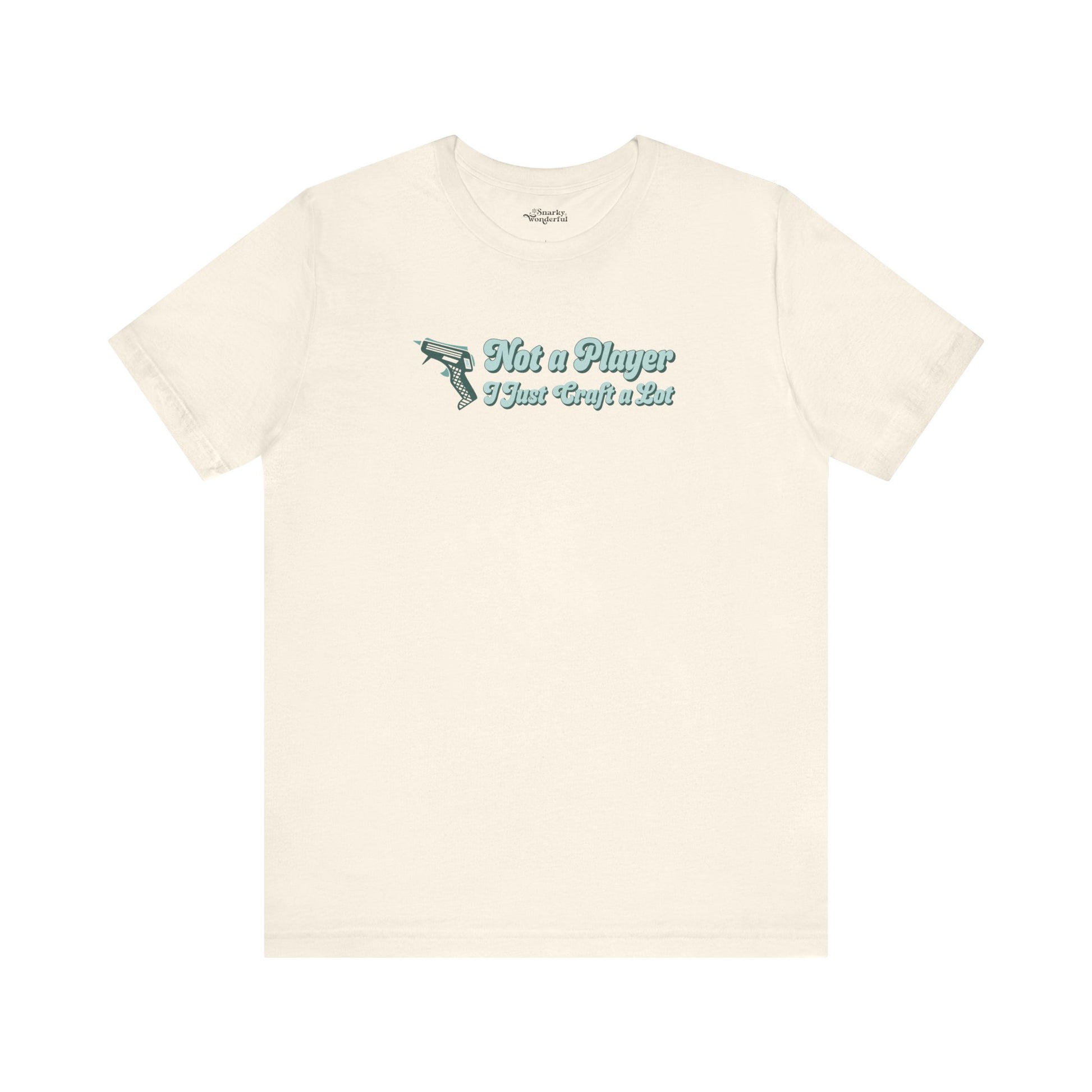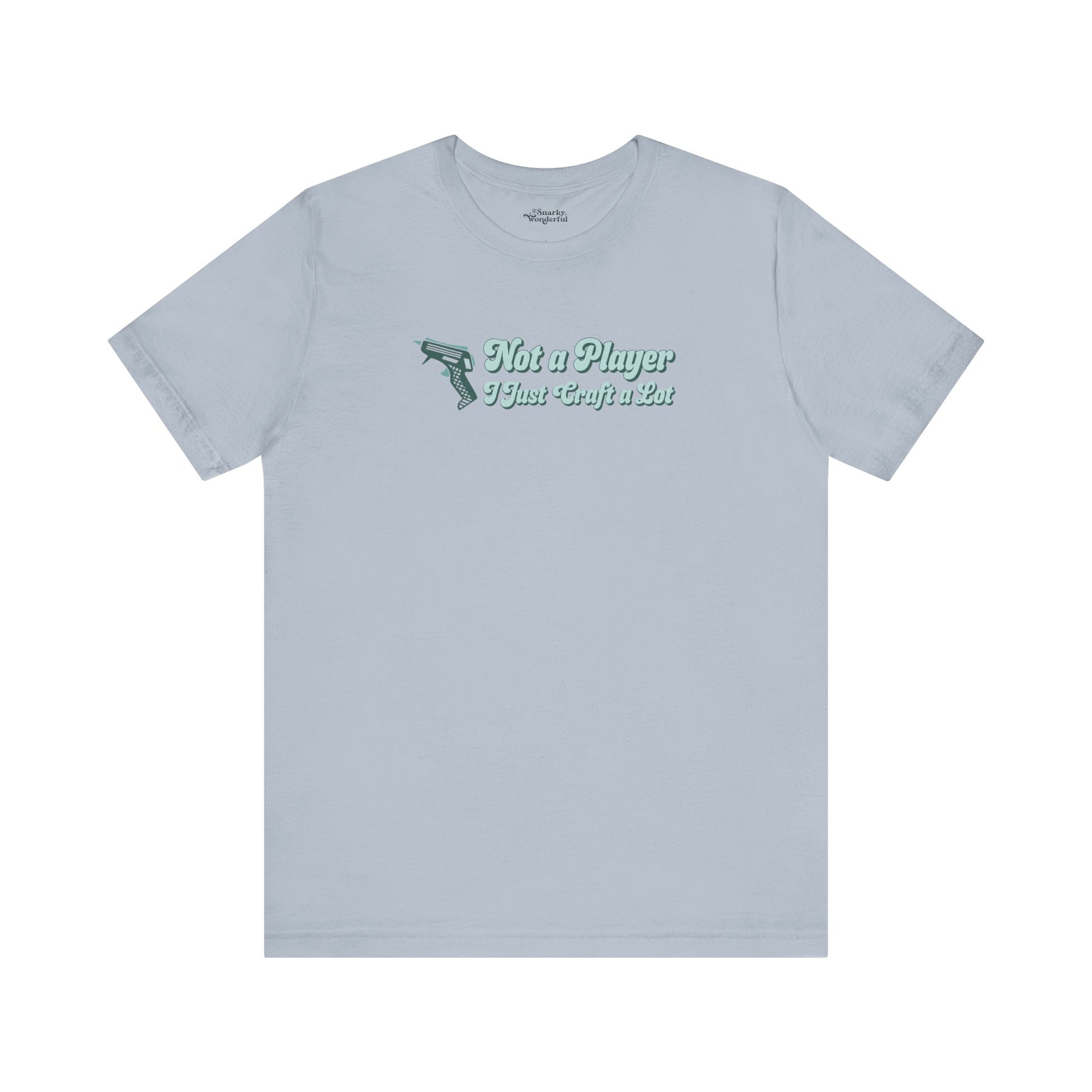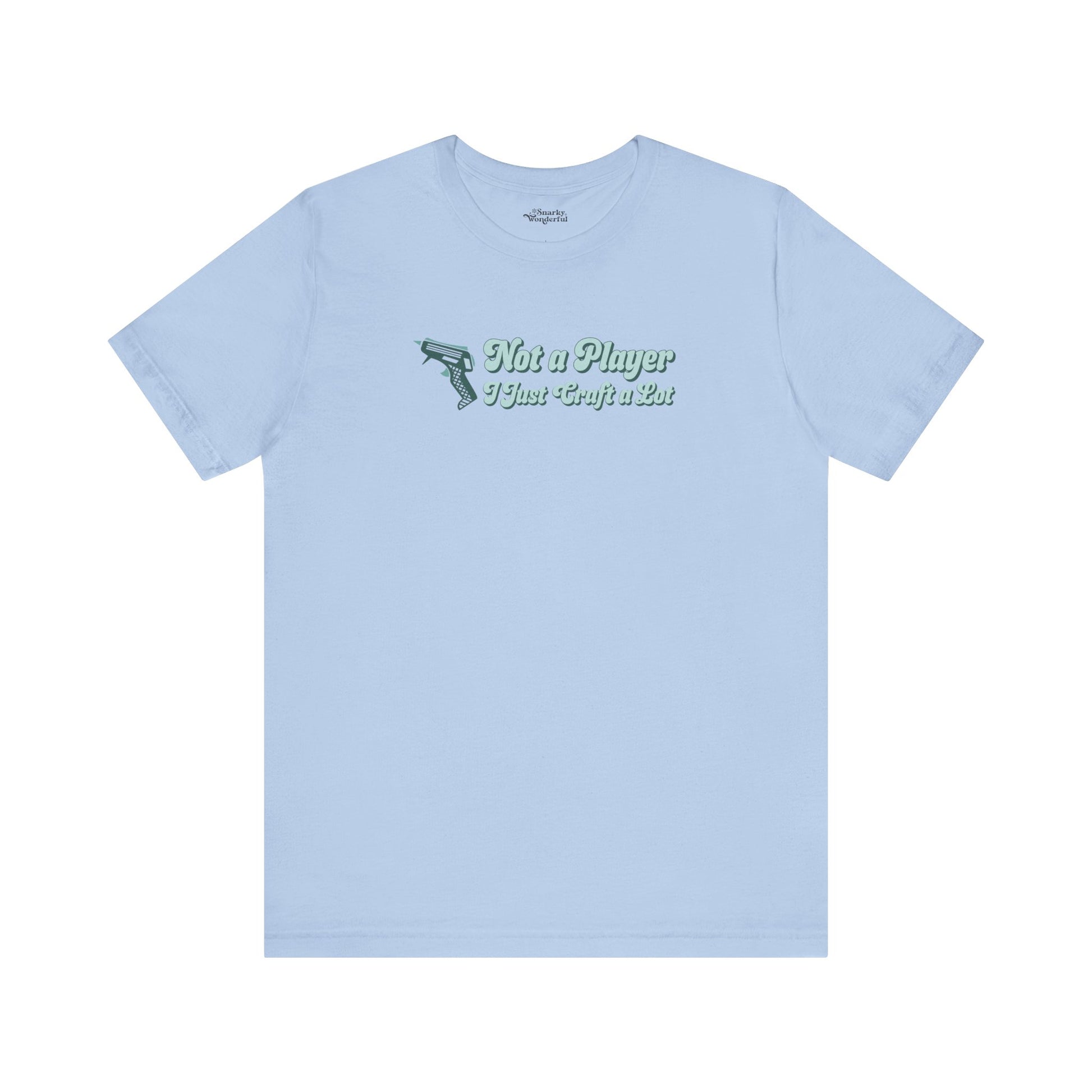 Channel your inner crafting legend with this playful 'Not a Player, I Just Craft a Lot' t-shirt! Featuring a graphic of a glue gun, this design is a fun nod to the classic Big Pun song, reimagined for creators.
