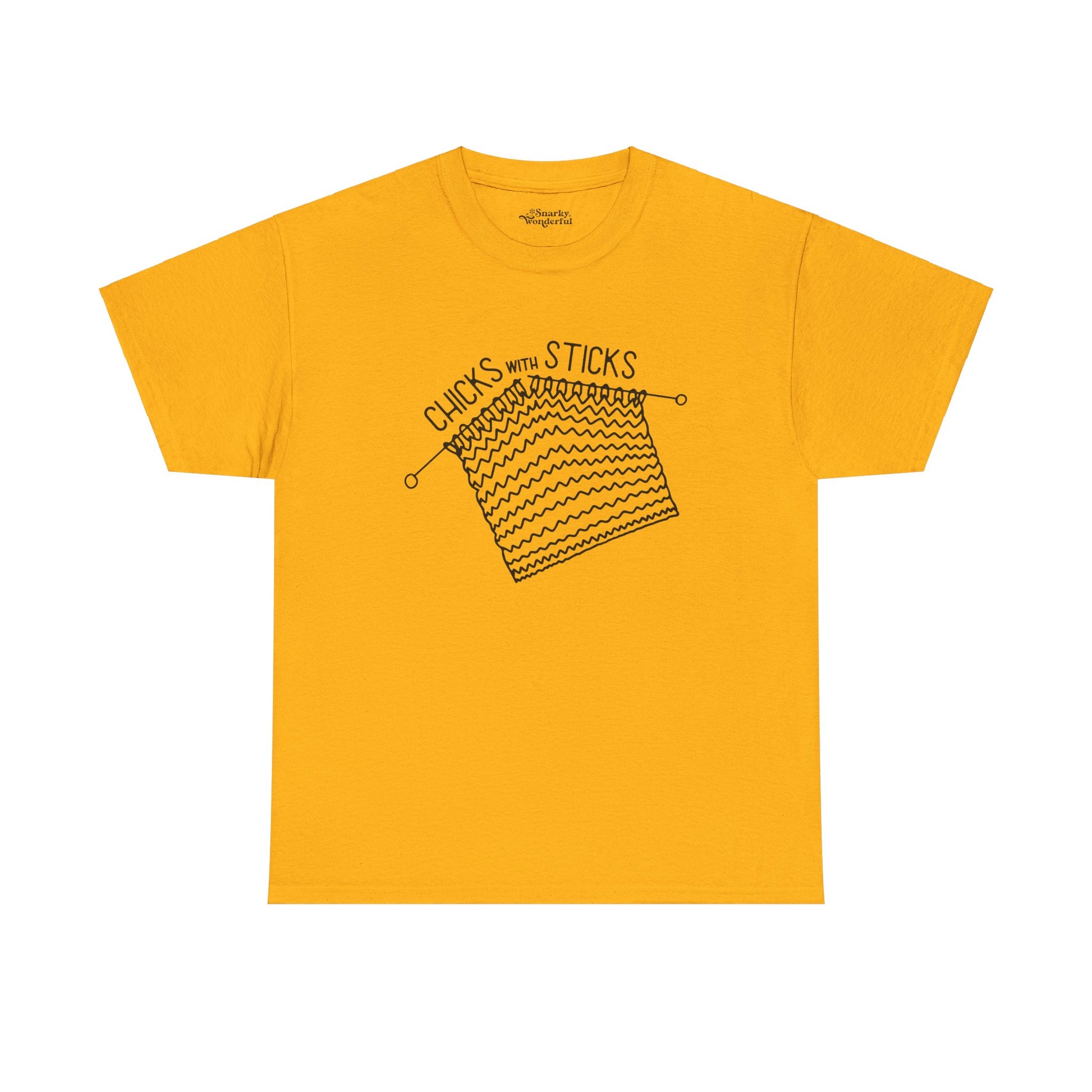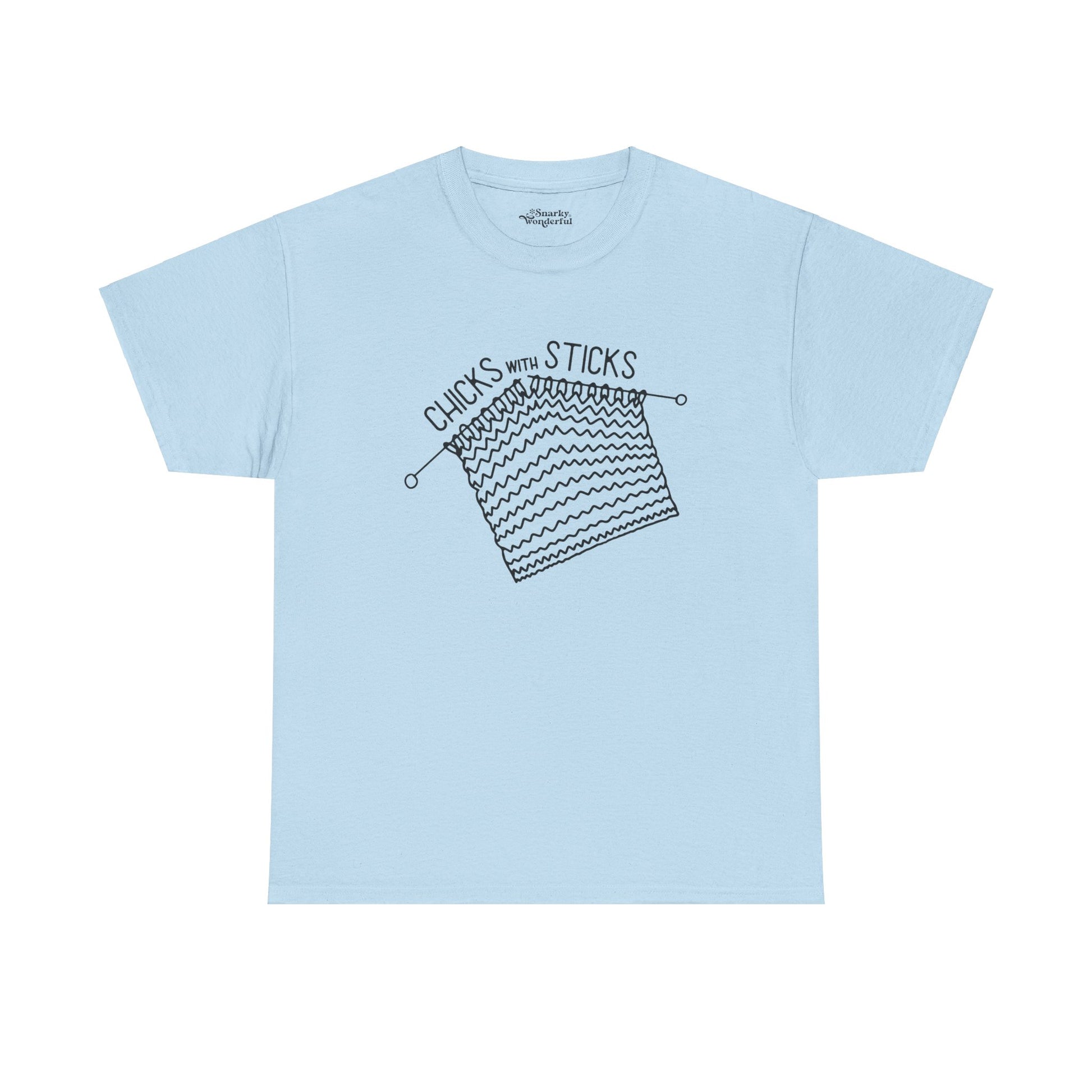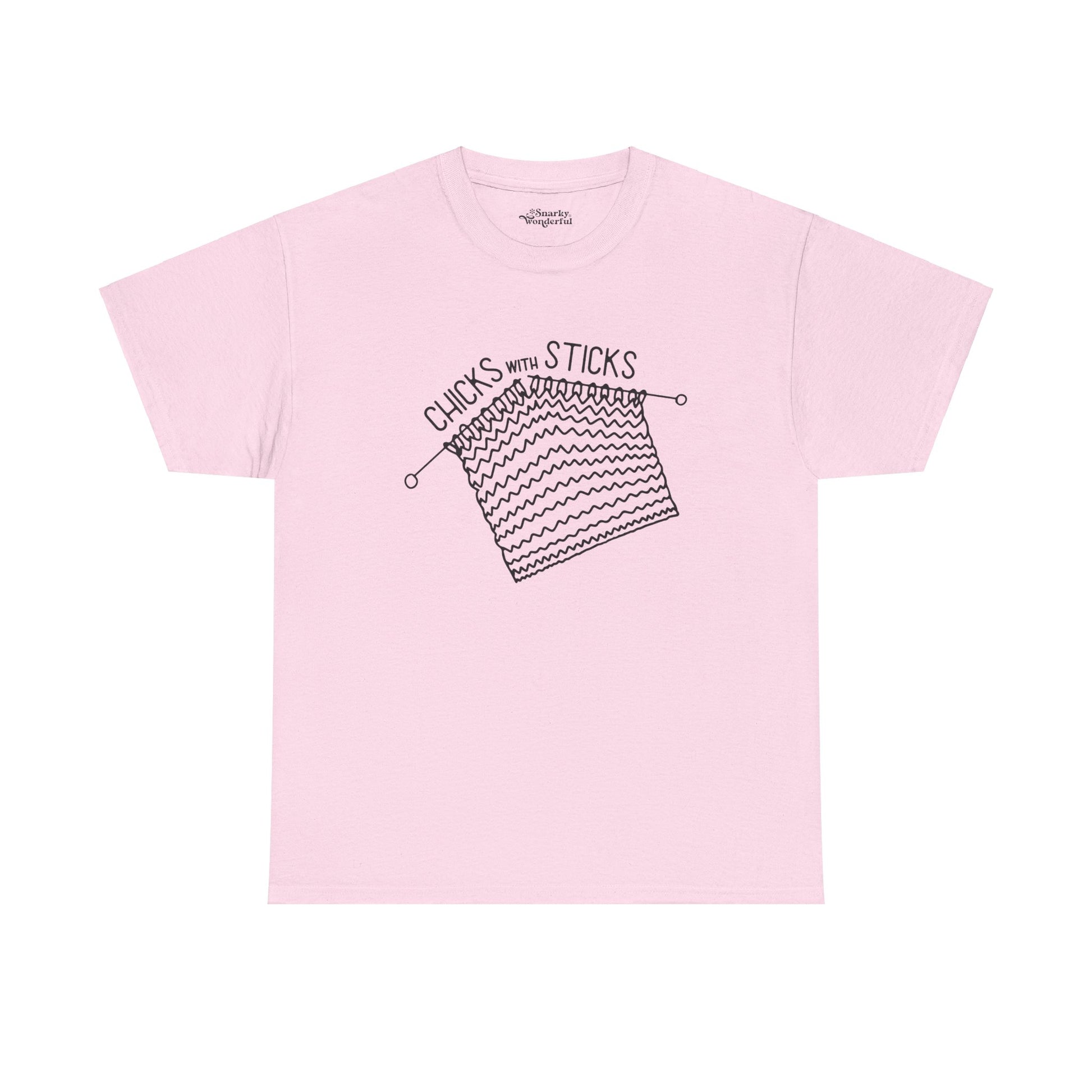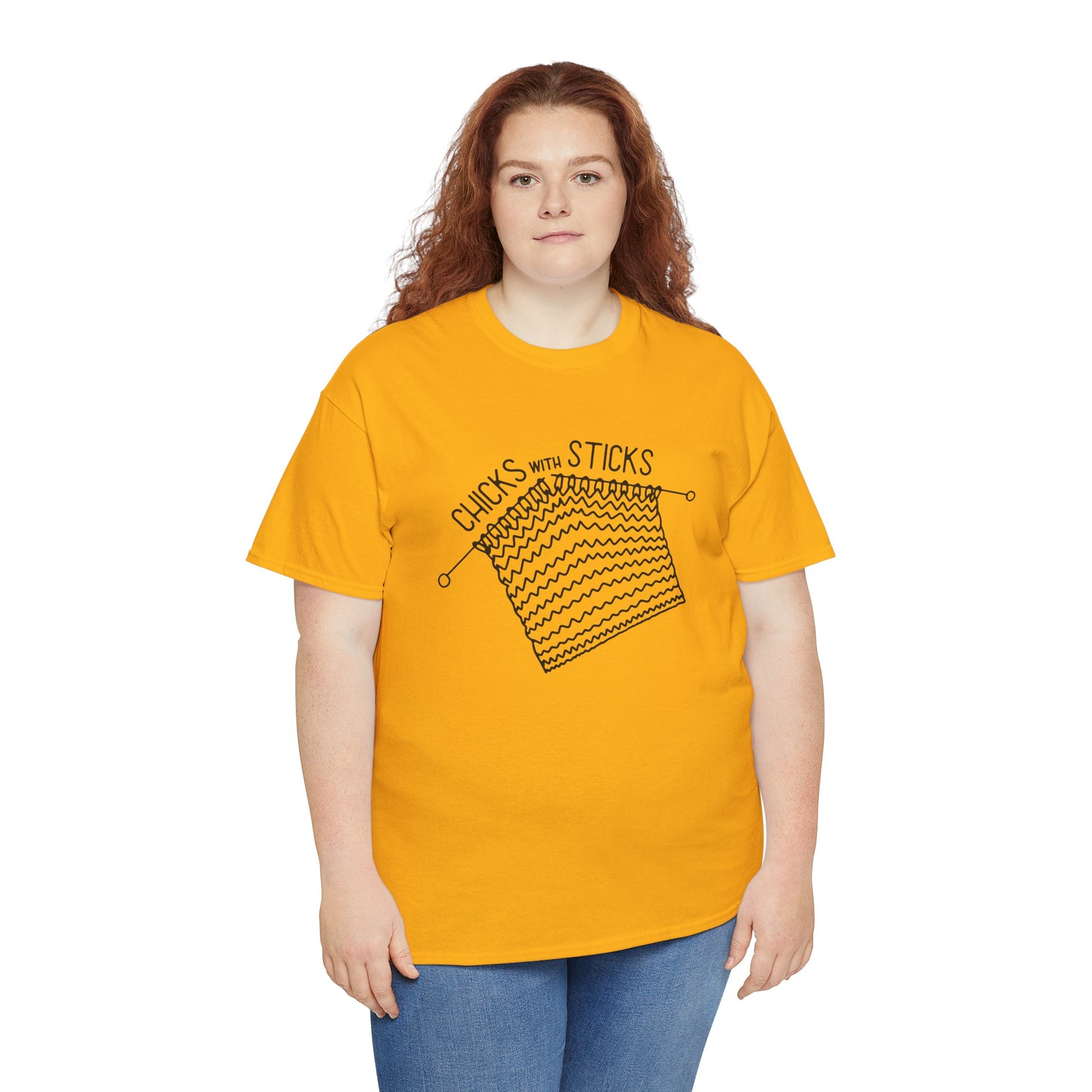 Show off your knitting pride with our playful 'Chicks with Sticks' t-shirt! Featuring a fun graphic of knitting needles and a project in progress, this design is made for knitters who love to flaunt their crafty skills.