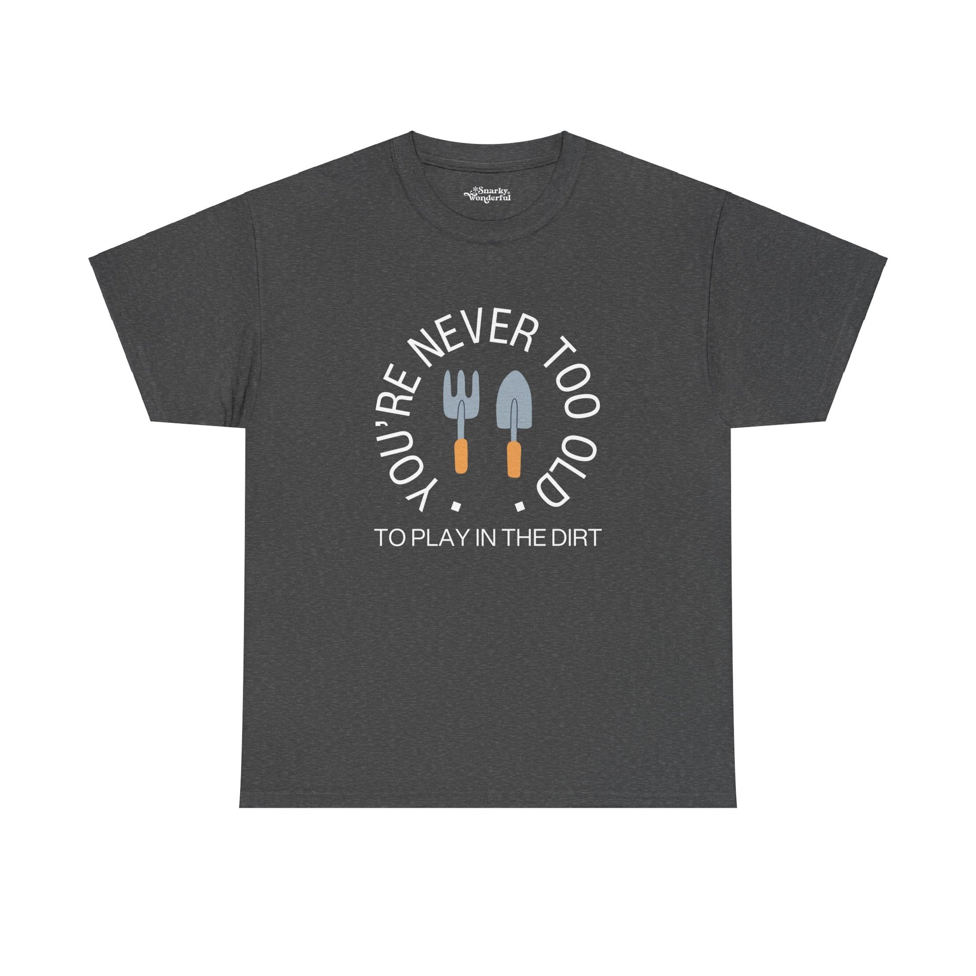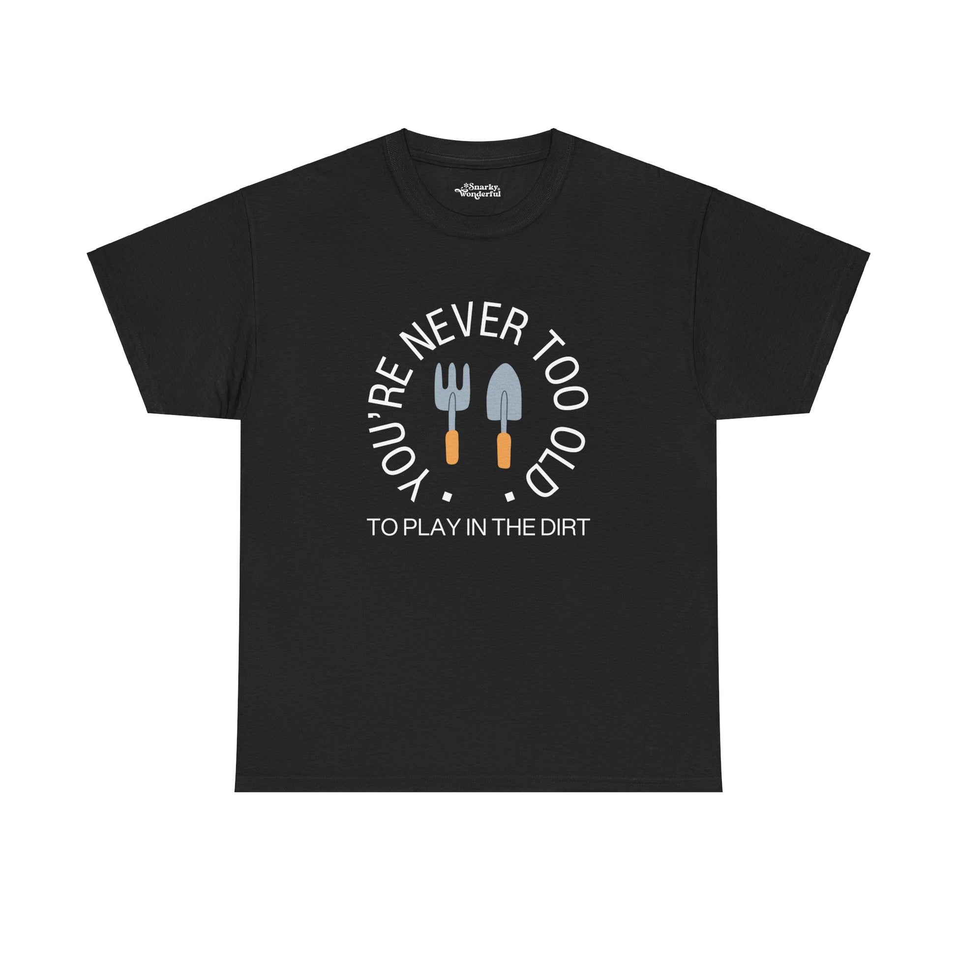 Celebrate your love for gardening with our 'You're Never Too Old to Play in the Dirt' t-shirt! Featuring a charming illustration of a trowel and hand fork, this tee is perfect for gardeners of any age who enjoy digging, planting, and getting their hands dirty.